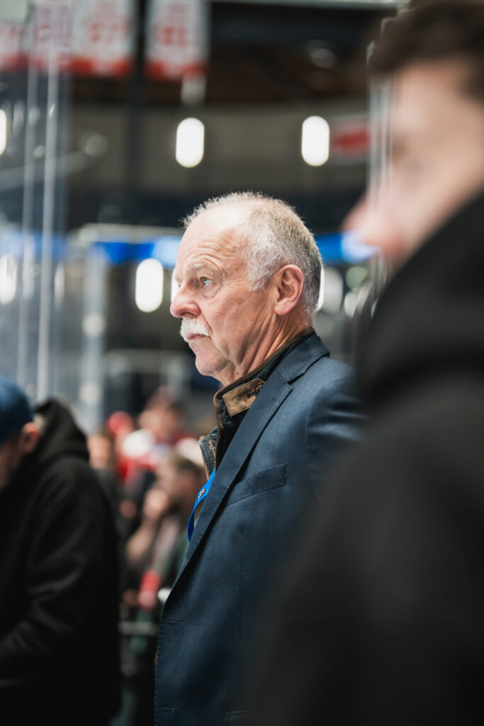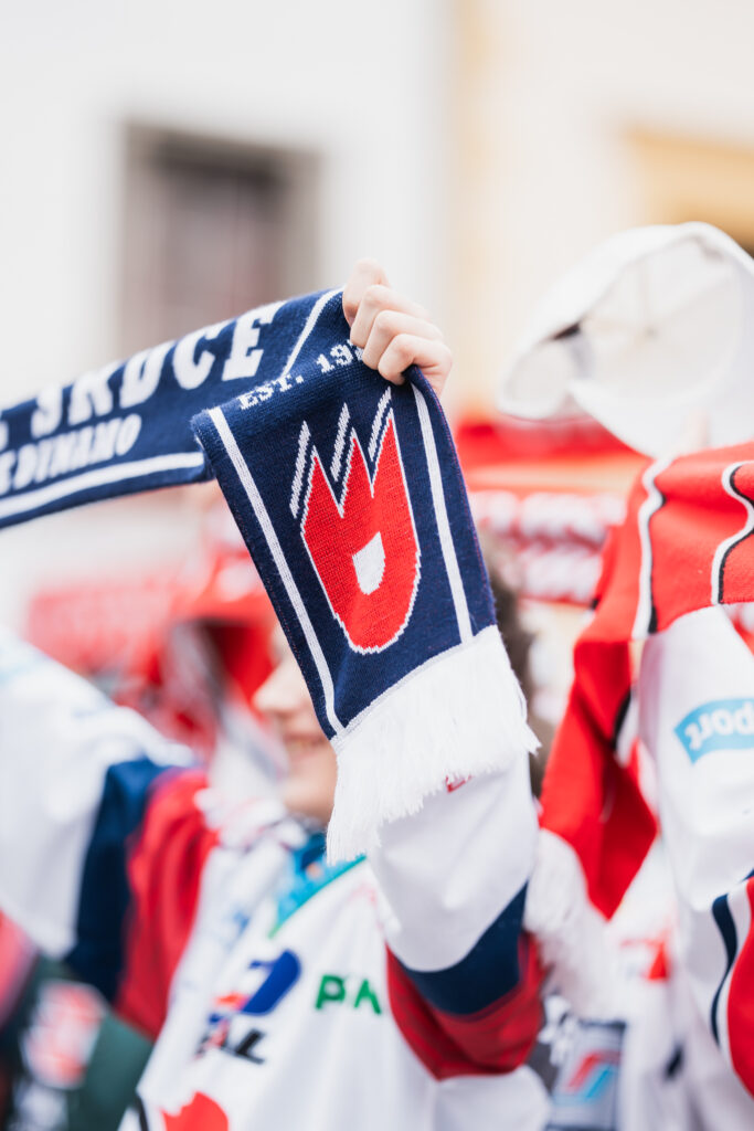 Paradoxně jedna z mých nejoblíbenějších fotek není z ledu ani tribun, ale z chvíle před arénou. Šel jsem fotit předzápasový program a okolo mě procházeli dva starší borci v dresech, kšiltovkách – nevěděli, že je fotím, prostě jen spolu šli na to předzápasový pivko. Obyčejně neobyčejná momentka, která v sobě má dlouholetý příběh – a to já mám rád